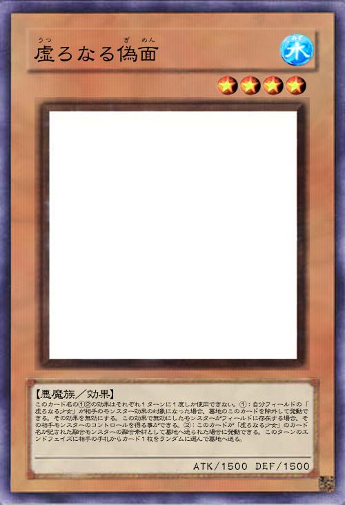 | このカード名の①②の効果はそれぞれ1ターンに1度しか使用できない。①:自分フィールドの「虚ろなる少女」が相手のモンスター効果の対象になった場合、墓地のこのカードを除外して発動できる。その効果を無効にする。この効果で無効にしたモンスターがフィールドに存在する場合、その相手モンスターのコントロールを得る事ができる。②:このカードが「虚ろなる少女」のカード名が記された融合モンスターの融合素材として墓地へ送られた場合に発動できる。このターンのエンドフェイズに相手の手札からカード1枚をランダムに選んで墓地へ送る。 | |||