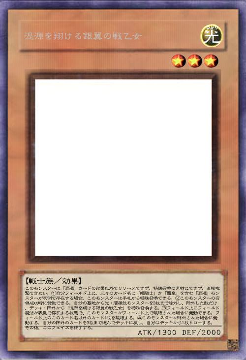 | このモンスターは「混源」カードの効果以外でリリースできず、特殊召喚の素材にできず、直接攻撃できない。①自分フィールド上に、元々のカード名に「姫騎士」か「覇皇」を含む「混源」モンスターが表側で存在する場合、このモンスターは手札から特殊召喚できる。②このモンスターの召喚成功時に発動できる。自分の墓地から光・闇属性モンスターを2枚まで除外し、除外した数だけ、デッキ・除外から「混源を翔ける銀翼の戦乙女」を特殊召喚する。③フィールド上にフィールド魔法が表側で存在する状態で、このモンスターがフィールド上で破壊された場合に発動できる。フィールド上のこのカード名以外のカード1枚を破壊する。④このモンスターが除外された場合に発動する。自分の除外のカードを3枚まで選んでデッキに戻し、自分はデッキから1枚ドローする。その後、このフェイズを終了する。 | |||