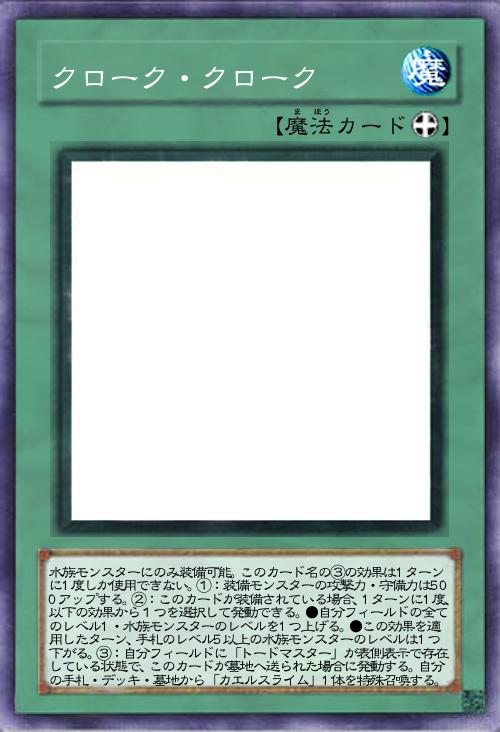 | 水族モンスターにのみ装備可能。このカード名の③の効果は1ターンに1度しか使用できない。①:装備モンスターの攻撃力・守備力は500アップする。②:このカードが装備されている場合、1ターンに1度、以下の効果から1つを選択して発動できる。●自分フィールドの全てのレべル1・水族モンスターのレベルを1つ上げる。●この効果を適用したターン、手札のレベル5以上の水族モンスターのレベルは1つ下がる。③:自分フィールドに「トードマスター」が表側表示で存在している状態で、このカードが墓地へ送られた場合に発動する。自分の手札・デッキ・墓地から「カエルスライム」1体を特殊召喚する。 | |||
