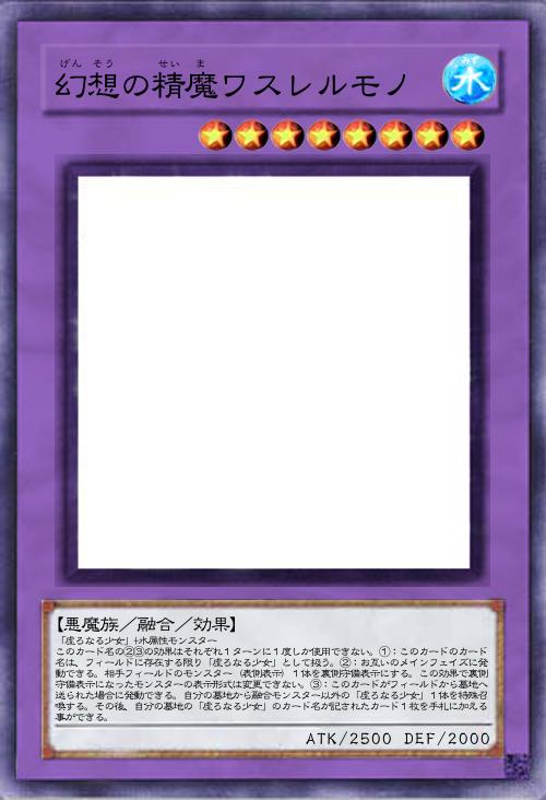 | 「虚ろなる少女」+水属性モンスター このカード名の②③の効果はそれぞれ1ターンに1度しか使用できない。①:このカードのカード名は、フィールドに存在する限り「虚ろなる少女」として扱う。②:お互いのメインフェイズに発動できる。相手フィールドのモンスター(表側表示)1体を裏側守備表示にする。この効果で裏側守備表示になったモンスターの表示形式は変更できない。③:このカードがフィールドから墓地へ送られた場合に発動できる。自分の墓地から融合モンスター以外の「虚ろなる少女」1体を特殊召喚する。その後、自分の墓地の「虚ろなる少女」のカード名が記されたカード1枚を手札に加える事ができる。 | |||