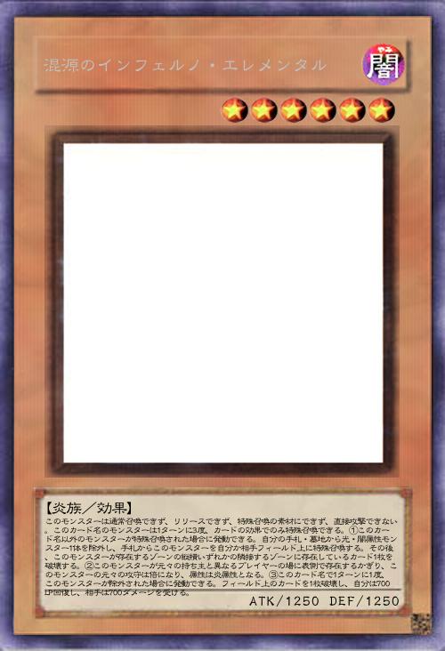 | このモンスターは通常召喚できず、リリースできず、特殊召喚の素材にできず、直接攻撃できない。このカード名のモンスターは1ターンに3度、カードの効果でのみ特殊召喚できる。①このカード名以外のモンスターが特殊召喚された場合に発動できる。自分の手札・墓地から光・闇属性モンスター1体を除外し、手札からこのモンスターを自分か相手フィールド上に特殊召喚する。その後、このモンスターが存在するゾーンの縦横いずれかの隣接するゾーンに存在しているカード1枚を破壊する。②このモンスターが元々の持ち主と異なるプレイヤーの場に表側で存在するかぎり、このモンスターの元々の攻守は倍になり、属性は炎属性となる。③このカード名で1ターンに1度、このモンスターが除外された場合に発動できる。フィールド上のカードを1枚破壊し、自分は700LP回復し、相手は700ダメージを受ける。 | |||