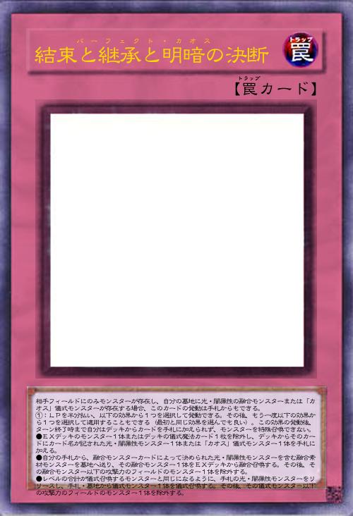 | 相手フィールドにのみモンスターが存在し、自分の墓地に光・闇属性の融合モンスターまたは「カオス」儀式モンスターが存在する場合、このカードの発動は手札からもできる。 ①:LPを半分払い、以下の効果から1つを選択して発動できる。その後、もう一度以下の効果から1つを選択して適用することもできる(最初と同じ効果を選んでも良い)。この効果の発動後、ターン終了時まで自分はデッキからカードを手札に加えられず、モンスターを特殊召喚できない。 ●EXデッキのモンスター1体またはデッキの儀式魔法カード1枚を除外し、デッキからそのカードにカード名が記された光・闇属性モンスター1体または「カオス」儀式モンスター1体を手札に加える。 ●自分の手札から、融合モンスターカードによって決められた光・闇属性モンスターを含む融合素材モンスターを墓地へ送り、その融合モンスター1体をEXデッキから融合召喚する。その後、その融合モンスター以下の攻撃力のフィールドのモンスター1体を除外する。 ●レベルの合計が儀式召喚するモンスターと同じになるように、手札の光・闇属性モンスターをリリースし、手札・墓地から儀式モンスター1体を儀式召喚する。その後、その儀式モンスター以下の攻撃力のフィールドのモンスター1体を除外する。 | |||