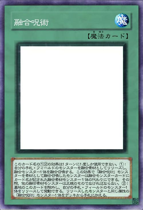| このカード名の①②の効果は1ターンに1度しか使用できない。①:自分の手札・フィールドのモンスターを融合素材としてリリースし、融合モンスター1体を融合召喚する。この効果で「融合呪印」モンスターを素材として融合召喚したモンスターは融合モンスターカードにカード名が記された融合素材モンスター1体の代わりにできる。その際、他の融合素材モンスターは正規のものでなければならない。②:墓地のこのカードを除外し、自分の手札・フィールドのモンスター1体をリリースして発動できる。リリースしたモンスターと同じ属性の「融合呪印」モンスター1体をデッキから手札に加える。 | |||