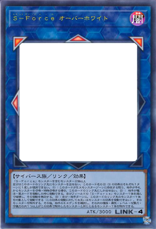 | 「S-Force」モンスターを含むモンスター2体以上 自分はこのカードのリンク先にモンスターを出せない。このカード名の(2)(3)の効果はそれぞれ1ターンに1度しか使用できない。(1):このカードがEXモンスターゾーンに存在する限り、相手が手札からモンスターを召喚・特殊召喚する場合、このカードのリンク先にしか出せない。(2): 相手が魔法・罠カードを発動した時に発動できる。自分フィールドの「S-Force」モンスター1体を選んで破壊し、その発動を無効する。(3):自分・相手ターンに、このカードのリンク先のモンスター1体を対象として発動できる(この効果の発動に対してお互いはモンスターの効果を発動できない)。そのモンスターを除外する。その後、相手のEXデッキを確認し、その内の種族・属性・レベル・攻撃力・守備力の内1つ以上がこの効果で除外したモンスターと同じとなるモンスター1体を除外できる。 | |||