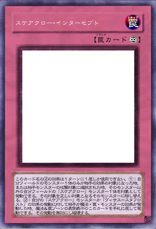 | このカード名の②の効果は1ターンに1度しか使用できない。①:自分フィールドのモンスター1体のみが相手の効果の対象になった時、または相手モンスターの攻撃対象に選択された時、そのモンスター以外の自分フィールドの「スケアクロー」モンスター1体を対象として発動できる。その対象を正しい対象となるそのモンスターに移し替える。②:自分の「スケアクロー」モンスターか「ヴィサス=スタフロスト」の効果の発動に対して相手が魔法・罠・モンスターの効果が発動した時、魔法&罠ゾーンの表側表示のこのカードを手札に戻して発動できる。その発動を無効にし破壊する。 | |||