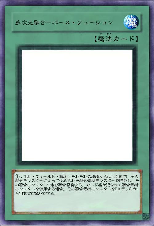 | ①:手札・フィールド・墓地(それぞれの場所からは1枚まで)から融合モンスターによって決められた融合素材モンスターを除外し、その融合モンスター1体を融合召喚する。カード名が記された融合素材モンスターを使用する場合、その融合素材モンスターをEXデッキから1体まで除外できる。 | |||