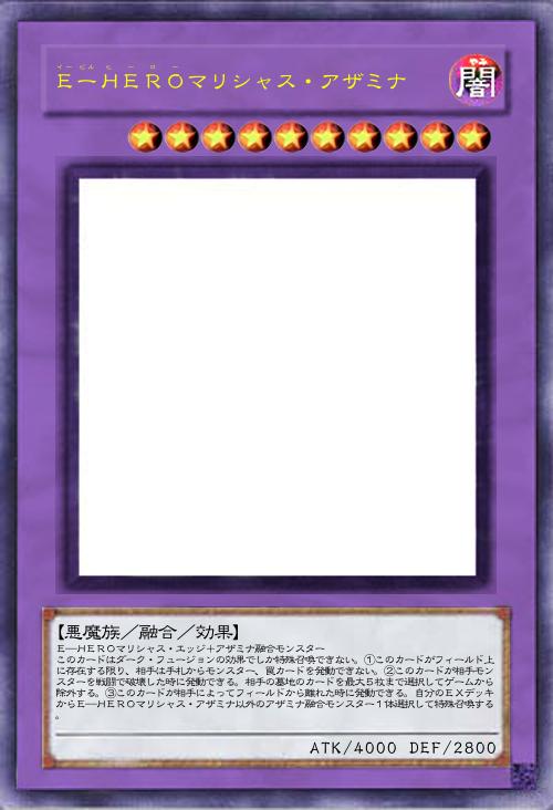 | E―HEROマリシャス・エッジ+アザミナ融合モンスター このカードはダーク・フュージョンの効果でしか特殊召喚できない。①このカードがフィールド上に存在する限り、相手は手札からモンスター、罠カードを発動できない。②このカードが相手モンスターを戦闘で破壊した時に発動できる。相手の墓地のカードを最大5枚まで選択してゲームから除外する。③このカードが相手によってフィールドから離れた時に発動できる。自分のEXデッキからE―HEROマリシャス・アザミナ以外のアザミナ融合モンスター1体選択して特殊召喚する。 | |||