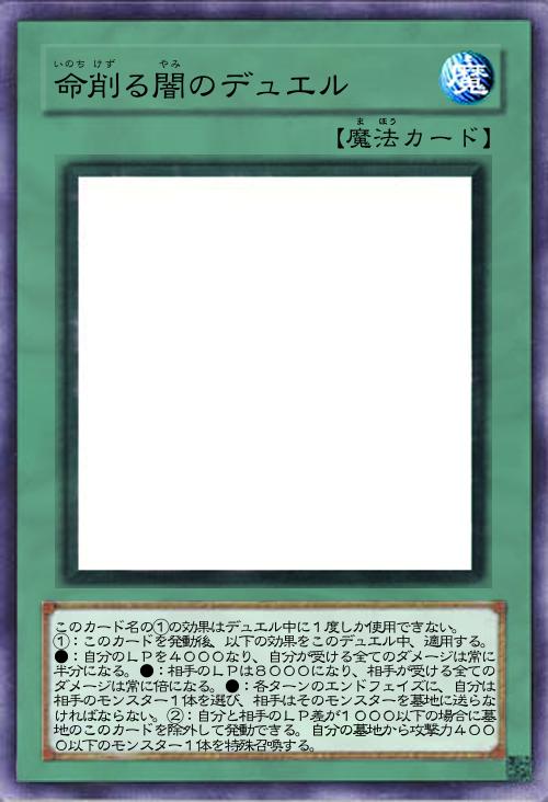 | このカード名の①の効果はデュエル中に1度しか使用できない。 ①:このカードを発動後、以下の効果をこのデュエル中、適用する。●:自分のLPを4000なり、自分が受ける全てのダメージは常に半分になる。●:相手のLPは8000になり、相手が受ける全てのダメージは常に倍になる。●:各ターンのエンドフェイズに、自分は相手のモンスター1体を選び、相手はそのモンスターを墓地に送らなければならない。②:自分と相手のLP差が1000以下の場合に墓地のこのカードを除外して発動できる。自分の墓地から攻撃力4000以下のモンスター1体を特殊召喚する。 | |||