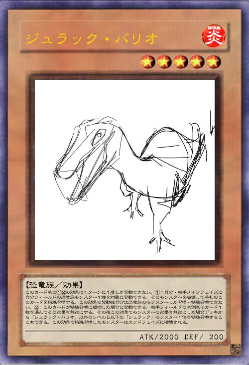 「ジュラック強化されたので昔考えたオリカに絵も一緒に考えてみました(雑)モチーフはバリオニクスです。某恐竜ゲームではスタン効果を持っていたのでそこを考慮して無効(スタン)効果を持たせました。この1枚で環境テーマと渡り合える程のパワーは付かないと思いますがあって困るものではないと思います。」(2024-10-12 20:17)