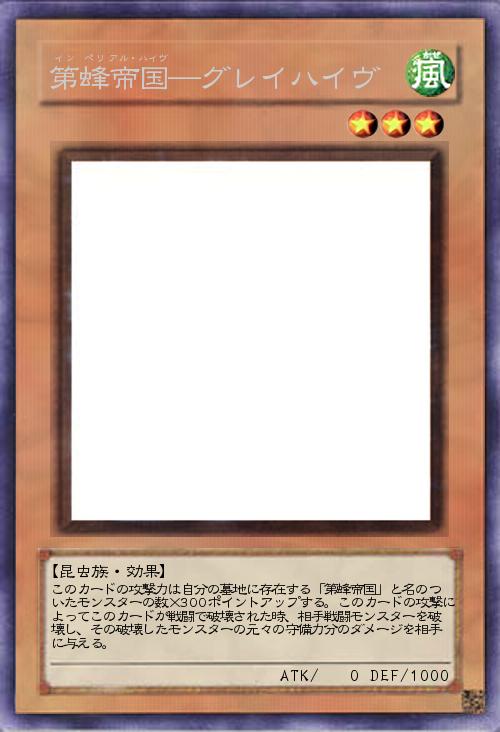 | このカードの攻撃力は自分の墓地に存在する「第蜂帝国」と名のついたモンスターの数×300ポイントアップする。このカードの攻撃によってこのカードが戦闘で破壊された時、相手戦闘モンスターを破壊し、その破壊したモンスターの元々の守備力分のダメージを相手に与える。 | |||