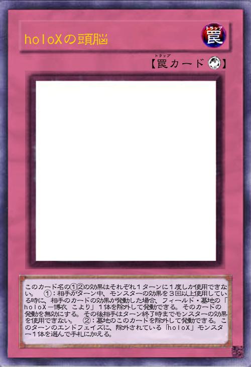 | このカード名の①②の効果はそれぞれ1ターンに1度しか使用できない。 ①:相手がターン中、モンスターの効果を3回以上使用している時に、相手のカードの効果が発動した場合、フィールド・墓地の「holoX-博衣 こより」1体を除外して発動できる。そのカードの発動を無効にする。その後相手はターン終了時までモンスターの効果を使用できない。 ②:墓地のこのカードを除外して発動できる。このターンのエンドフェイズに、除外されている「holoX」モンスター1体を選んで手札に加える。 | |||