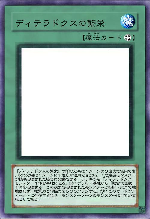| 「ディテラドクスの繁栄」の①の効果は1ターンに3度まで使用でき、②の効果は1ターンに1度しか使用できない。:恐竜族モンスターが特殊召喚された場合に発動できる。デッキから「ディテラドクス」モンスター1体を墓地に送る。②:デッキ・墓地から「超古代恐獣」1体を召喚する。この効果で召喚されたモンスターは戦闘・効果で破壊されず、攻撃力と守備力を500アップする。③:このカードがフィールドに存在する限り、モンスターゾーンのモンスターは全て恐竜族として扱う。 | |||