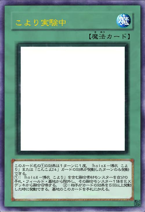 | このカード名の①の効果は1ターンに1度、「holoX-博衣 こより」または「こんこよ24」カードの効果が発動したターンのみ発動できる。 ①:「holoX-博衣 こより」を含む融合素材モンスターを自分の手札・フィールド・墓地から除外し、その融合モンスター1体をEXデッキから融合召喚する。 ②:相手がカードの効果を5回以上発動した時に発動できる。墓地のこのカードを手札に加える。 | |||