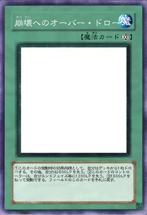 | ①このカードの発動時の効果処理として、自分はデッキから1枚ドローする。その後、自分は2500LPを失う。②このカードのコントローラーは、自分エンドフェイズ毎に1200LPを失う。③1500LPを払って発動できる。フィールドのこのカードを手札に戻す。 | |||