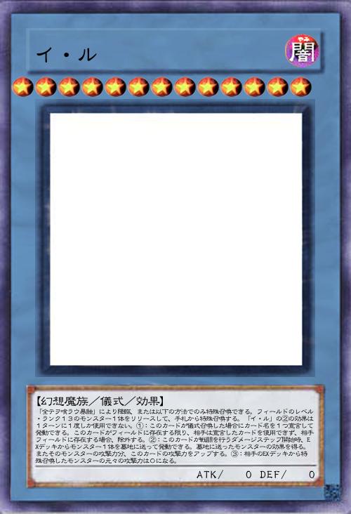 | 「全テヲ喰ラウ暴蝕」により降臨、または以下の方法でのみ特殊召喚できる。フィールドのレベル・ランク13のモンスター1体をリリースして、手札から特殊召喚する。「イ・ル」の②の効果は1ターンに1度しか使用できない。①:このカードが儀式召喚した場合にカード名を1つ宣言して発動できる。このカードがフィールドに存在する限り、相手は宣言したカードを使用できず、相手フィールドに存在する場合、除外する。②:このカードが戦闘を行うダメージステップ開始時、EXデッキからモンスター1体を墓地に送って発動できる。墓地に送ったモンスターの効果を得る。またそのモンスターの攻撃力分、このカードの攻撃力をアップする。③:相手のEXデッキから特殊召喚したモンスターの元々の攻撃力は0になる。 | |||