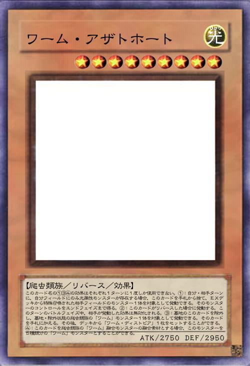 ④は2体融合から6素材ワームゼロを生み出せる、最低限の仕事を可能にする効果となります。アザトホースたくさんワームがくっついてるので問題ないかと思います。ただし、融合素材に使用したワームモンスターの種類を盛るだけなので1体で融合することはできません。このモンスター2体でワームゼロを融合した場合は5種類分の素材を使用したとして換算します。5種類分の素材になっているアザトホートと、当然1種類分であるアザトホートを融合しても、使用しているのは「アザトホート」のみであるためです。融合素材にする際に、ワームアザトホート1枚を5種類分の素材にする効果のためにこういうこととなります。