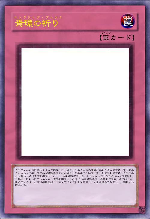 | 自分フィールドにモンスターが存在しない場合、このカードの発動は手札からもできる。①:相手フィールドにモンスターが特殊召喚された場合、その内の1体を対象として発動できる。自分の手札・墓地から「焉環の導き カレン」1体を特殊召喚する。セットされていたこのカードを発動した場合、代わりにデッキから「焉環の導き カレン」1体を特殊召喚する事もできる。その後、対象のモンスターと同じ属性を持つ「エンデリング」モンスター1体を自分のEXデッキ・墓地から除外する。 | |||