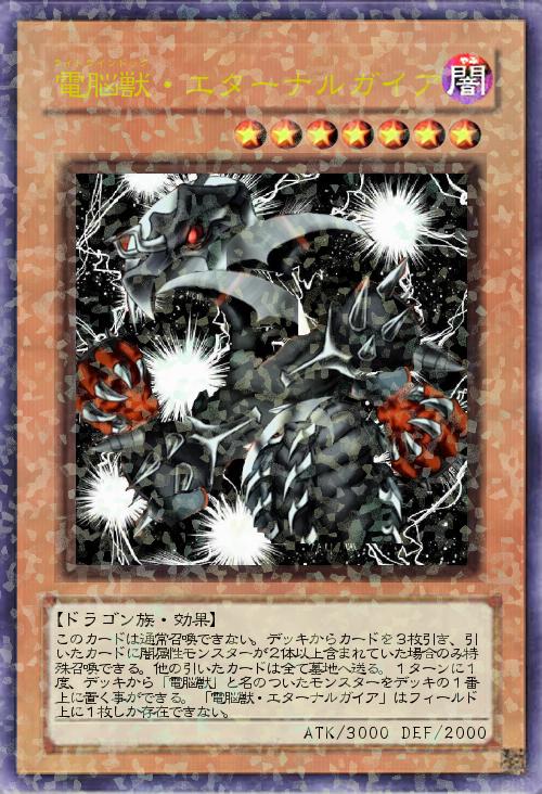 | このカードは通常召喚できない。デッキからカードを3枚引き、引いたカードに闇属性モンスターが2体以上含まれていた場合のみ特殊召喚できる。他の引いたカードは全て墓地へ送る。1ターンに1度、デッキから「電脳獣」と名のついたモンスターをデッキの1番上に置く事ができる。「電脳獣・エターナルガイア」はフィールド上に1枚しか存在できない。 | |||