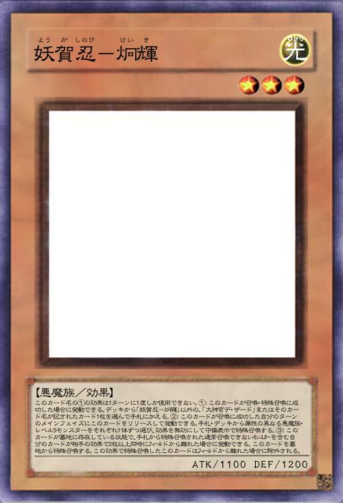 | このカード名の①の効果は1ターンに1度しか使用できない。①:このカードが召喚・特殊召喚に成功した場合に発動できる。デッキから「妖賀忍-炯輝」以外の、「大神官デ・ザード」またはそのカード名が記されたカード1枚を選んで手札に加える。②:このカードが召喚に成功した自分のターンのメインフェイズにこのカードをリリースして発動できる。手札・デッキから属性の異なる悪魔族・レベル3モンスターをそれぞれ1体ずつ選び、効果を無効にして守備表示で特殊召喚する。③:このカードが墓地に存在している状態で、手札から特殊召喚された通常召喚できないモンスターを含む自分のカードが相手の効果で2枚以上同時にフィールドから離れた場合に発動できる。このカードを墓地から特殊召喚する。この効果で特殊召喚したこのカードはフィールドから離れた場合に除外される。 | |||