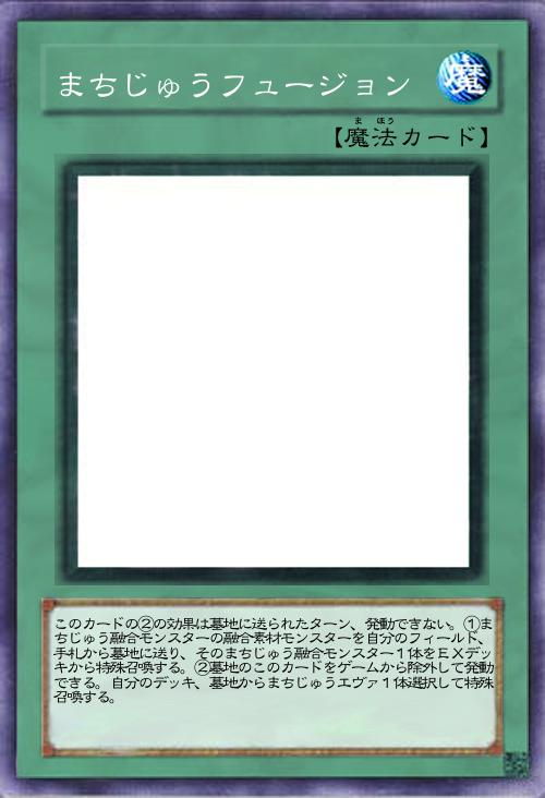 | このカードの②の効果は墓地に送られたターン、発動できない。①まちじゅう融合モンスターの融合素材モンスターを自分のフィールド、手札から墓地に送り、そのまちじゅう融合モンスター1体をEXデッキから特殊召喚する。②墓地のこのカードをゲームから除外して発動できる。自分のデッキ、墓地からまちじゅうエヴァ1体選択して特殊召喚する。 | |||
