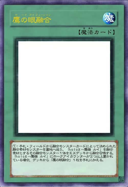 | ①:手札・フィールドから融合モンスターカードによって決められた融合素材モンスターを墓地へ送り、「holoX-鷹嶺 ルイ」を融合素材とするその融合モンスター1体をEXデッキから融合召喚する。「holoX-鷹嶺 ルイ」にホークアイカウンターが2つ以上置かれている場合、デッキから「鷹の眼融合」1枚を手札に加える。 | |||