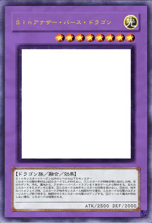 | Sinモンスター+トークン以外のレベル4以下のモンスター このカードの融合素材は上記のカードでしか行えない。①このカードが特殊召喚に成功した時、自分のデッキ、手札、墓地から、アナザー・バース・ドラゴンを1体をゲームから除外する。またはこのカードをEXデッキに戻す。②このカードは相手モンスターの効果を受けない。③自分、相手のバトルフェイズ時、このカードが相手モンスターと戦闘を行う場合、このカードの攻撃力はダメージステップ終了時まで、戦闘を行うモンスターの攻撃力分アップする。④フィールド魔法が存在しない場合、このカードは破壊される。 | |||