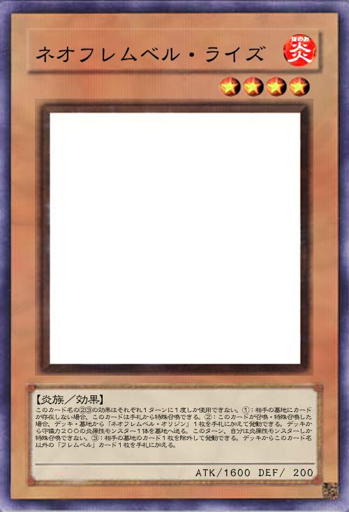 | このカード名の②③の効果はそれぞれ1ターンに1度しか使用できない。①:相手の墓地にカードが存在しない場合、このカードは手札から特殊召喚できる。②:このカードが召喚・特殊召喚した場合、デッキ・墓地から「ネオフレムベル・オリジン」1枚を手札に加えて発動できる。デッキから守備力200の炎属性モンスター1体を墓地へ送る。このターン、自分は炎属性モンスターしか特殊召喚できない。③:相手の墓地のカード1枚を除外して発動できる。デッキからこのカード名以外の「フレムベル」カード1枚を手札に加える。 | |||
