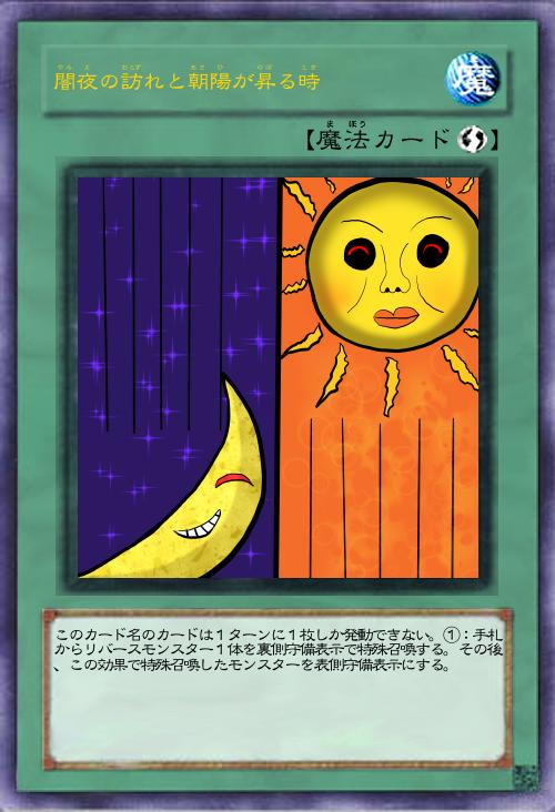「月の夜を裏側守備表示に見立て、太陽の朝を表側守備表示に見立てたイラストのカードを作ってみました。