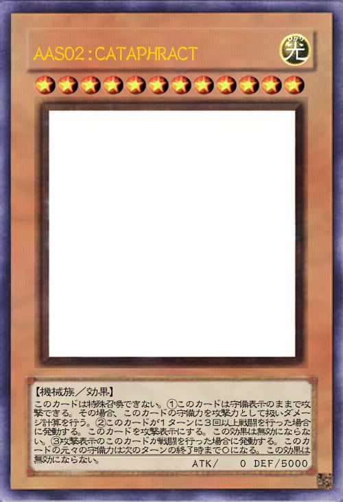 | このカードは特殊召喚できない。①このカードは守備表示のままで攻撃できる。その場合、このカードの守備力を攻撃力として扱いダメージ計算を行う。②このカードが1ターンに3回以上戦闘を行った場合に発動する。このカードを攻撃表示にする。この効果は無効にならない。③攻撃表示のこのカードが戦闘を行った場合に発動する。このカードの元々の守備力は次のターンの終了時まで0になる。この効果は無効にならない。 | |||