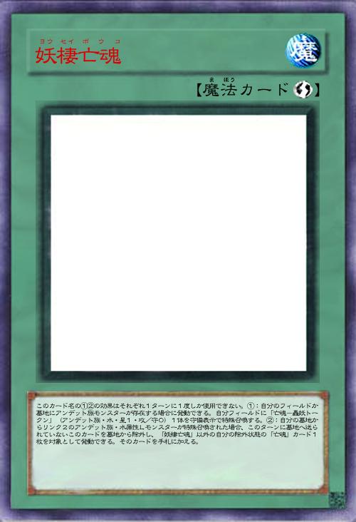 | このカード名の①②の効果はそれぞれ1ターンに1度しか使用できない。①:自分のフィールドか墓地にアンデット族モンスターが存在する場合に発動できる。自分フィールドに「亡魂-轟妖トークン」(アンデット族・水・星1・攻/守0)1体を守備表示で特殊召喚する。②:自分の墓地からリンク2のアンデット族・水属性Lモンスターが特殊召喚された場合、このターンに墓地へ送られていないこのカードを墓地から除外し、「妖棲亡魂」以外の自分の除外状態の「亡魂」カード1枚を対象として発動できる。そのカードを手札に加える。 | |||