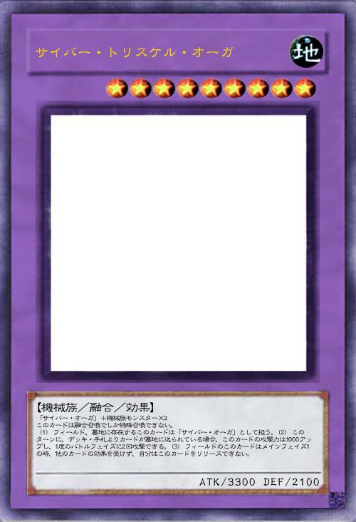 | 「サイバー・オーガ」+機械族モンスター×2 このカードは融合召喚でしか特殊召喚できない。 (1) フィールド、墓地に存在するこのカードは「サイバー・オーガ」として扱う。(2) このターンに、デッキ・手札よりカードが墓地に送られている場合、このカードの攻撃力は1000アップし、1度のバトルフェイズに2回攻撃できる。(3) フィールドのこのカードはメインフェイズ1の時、他のカードの効果を受けず、自分はこのカードをリリースできない。 | |||