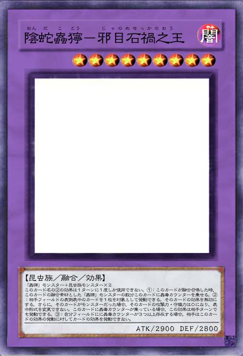 | 「蟲獰」モンスター+昆虫族モンスター×2 このカード名の②の効果は1ターンに1度しか使用できない。①:このカードが融合召喚した時、このカードの融合素材とした「蟲獰」モンスターの数分このカードに蟲毒カウンターを乗せる。②:相手フィールドの表側表示のカードを1枚を対象として発動できる。そのカードの効果を無効にする。さらに、そのカードがモンスターだった場合、そのカードの攻撃力・守備力は0になり、表示形式を変更できない。このカードに蟲毒カウンターが乗っている場合、この効果は相手ターンでも発動できる。③:自分フィールドにに蟲毒カウンターが3つ以上存在する場合、相手はこのカードの効果の発動に対してカードの効果を発動できない。 | |||
