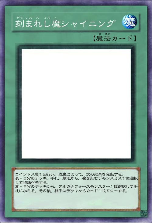 | コイントスを1回行い、表裏によって、次の効果を発動する。 表・自分のデッキ、手札、墓地から、魔を刻むデモンスミス1体選択して特殊召喚する。 裏・自分のデッキから、アルカナフォースモンスター1体選択して手札に加える。その後、相手はデッキからカード1枚ドローする。 | |||