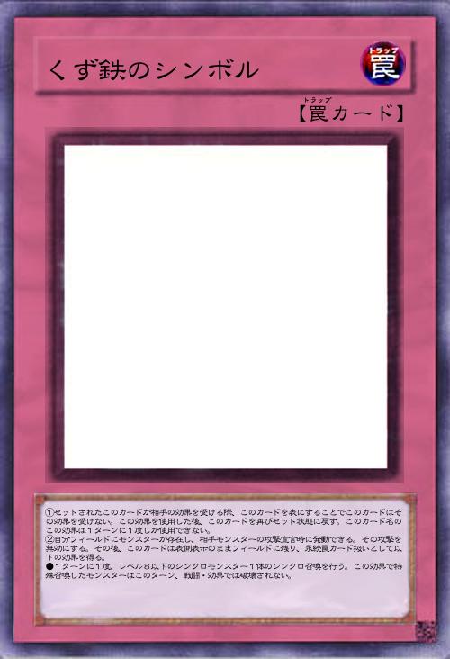 | ①セットされたこのカードが相手の効果を受ける際、このカードを表にすることでこのカードはその効果を受けない。この効果を使用した後、このカードを再びセット状態に戻す。このカード名のこの効果は1ターンに1度しか使用できない。 ②自分フィールドにモンスターが存在し、相手モンスターの攻撃宣言時に発動できる。その攻撃を無効にする。その後、このカードは表側表示のままフィールドに残り、永続罠カード扱いとして以下の効果を得る。 ●1ターンに1度、レベル8以下のシンクロモンスター1体のシンクロ召喚を行う。この効果で特殊召喚したモンスターはこのターン、戦闘・効果では破壊されない。 | |||