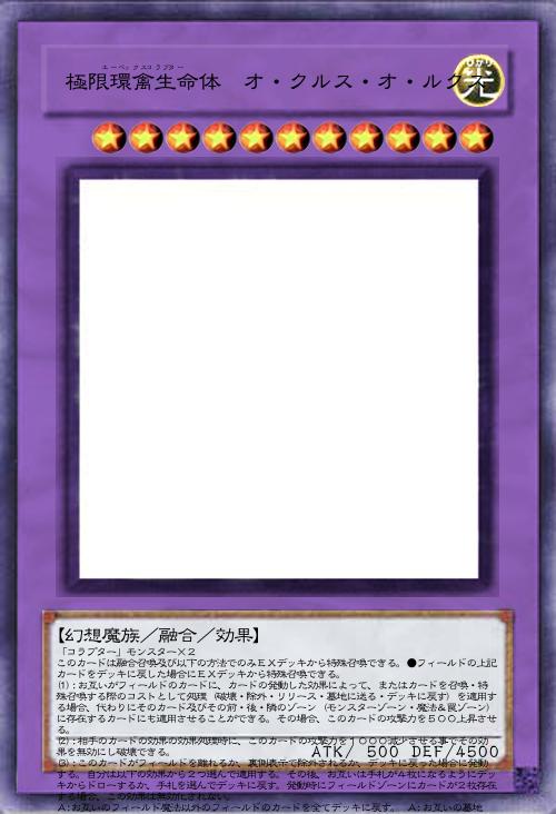 | 「コラプター」モンスター×2 このカードは融合召喚及び以下の方法でのみEXデッキから特殊召喚できる。●フィールドの上記カードをデッキに戻した場合にEXデッキから特殊召喚できる。 (1):お互いがフィールドのカードに、カードの発動した効果によって、またはカードを召喚・特殊召喚する際のコストとして処理(破壊・除外・リリース・墓地に送る・デッキに戻す)を適用する場合、代わりにそのカード及びその前・後・隣のゾーン(モンスターゾーン・魔法&罠ゾーン)に存在するカードにも適用させることができる。その場合、このカードの攻撃力を500上昇させる。 (2):相手のカードの効果の効果処理時に、このカードの攻撃力を1000減少させる事でその効果を無効にし破壊できる。 (3):このカードがフィールドを離れるか、裏側表示で除外されるか、デッキに戻った場合に発動する。自分は以下の効果から2つ選んで適用する。その後、お互いは手札が4枚になるようにデッキからドローするか、手札を選んでデッキに戻す。発動時にフィールドゾーンにカードが2枚存在する場合、この効果は無効化されない。 A:お互いのフィールド魔法以外のフィールドのカードを全てデッキに戻す。 A:お互いの墓地に存在するカードを全てデッキに戻す。 A:お互いの除外状態のカードを全てデッキに戻す。A:お互いのEXデッキの表側表示のカードを全てデッキに戻す。 | |||