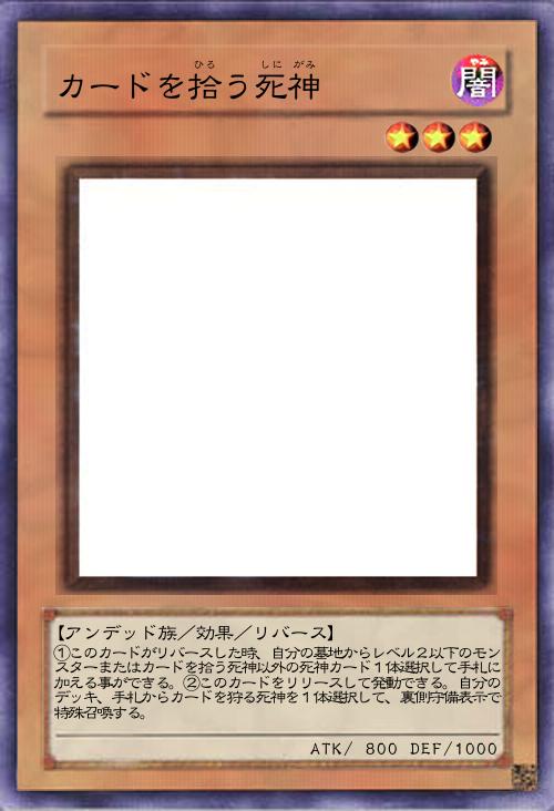 | ①このカードがリバースした時、自分の墓地からレベル2以下のモンスターまたはカードを拾う死神以外の死神カード1体選択して手札に加える事ができる。②このカードをリリースして発動できる。自分のデッキ、手札からカードを狩る死神を1体選択して、裏側守備表示で特殊召喚する。 | |||