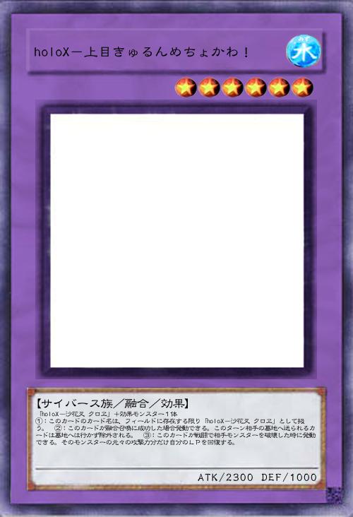 | 「holoX-沙花叉 クロヱ」+効果モンスター1体 ①:このカードのカード名は、フィールドに存在する限り「holoX-沙花叉 クロヱ」として扱う。 ②:このカードが融合召喚に成功した場合発動できる。このターン相手の墓地へ送られるカードは墓地へは行かず除外される。 ③:このカードが戦闘で相手モンスターを破壊した時に発動できる。そのモンスターの元々の攻撃力分だけ自分のLPを回復する。 | |||