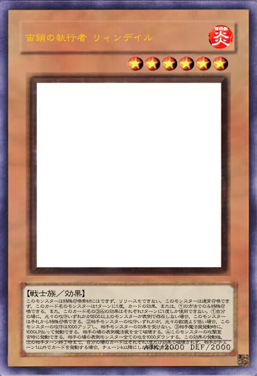 | このモンスターは特殊召喚素材にはできず、リリースもできない。このモンスターは通常召喚できず、このカード名のモンスターは1ターンに1度、カードの効果、または、①の方法でのみ特殊召喚できる。また、このカード名の③④の効果はそれぞれ1ターンに1度しか使用できない。①自分の場に、元々の攻守いずれかが2500以上のモンスターが表側で存在しない場合、このモンスターは手札から特殊召喚できる。②相手モンスターの攻守いずれかが、元々の数値より低い場合、このモンスターの攻守は1000アップし、相手モンスターの効果を受けない。③相手魔法罠発動時に、1000LP払って発動できる。相手の場の表側魔法罠を全て破壊する。④このモンスターの攻撃宣言時に発動できる。相手の場の表側モンスター全ての攻を1000ダウンする。この効果の発動後、次の相手ターン終了時まで、自分の場のカードはそれぞれ1度だけ効果で破壊されず、相手がチェーン1以外でカードを発動する場合、チェーン4以降にしか発動できない。 | |||
