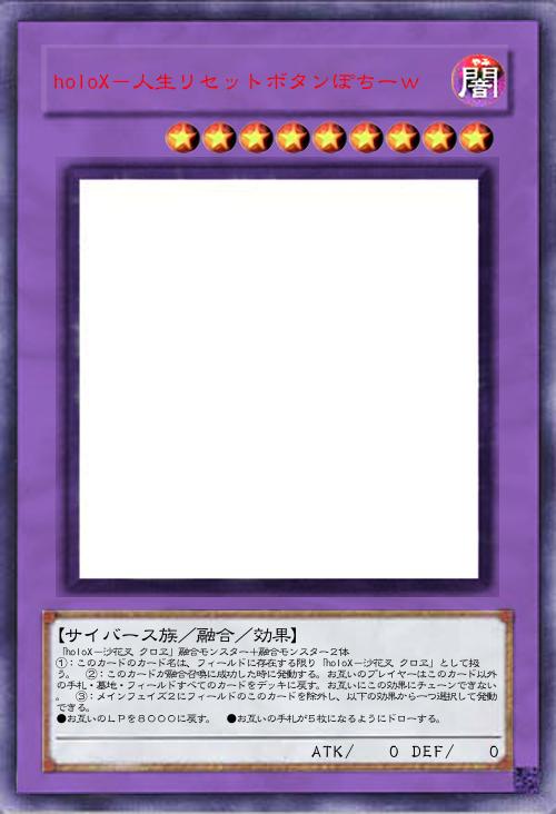 | 「holoX-沙花叉 クロヱ」融合モンスター+融合モンスター2体 ①:このカードのカード名は、フィールドに存在する限り「holoX-沙花叉 クロヱ」として扱う。 ②:このカードが融合召喚に成功した時に発動する。お互いのプレイヤーはこのカード以外の手札・墓地・フィールドすべてのカードをデッキに戻す。お互いにこの効果にチェーンできない。 ③:メインフェイズ2にフィールドのこのカードを除外し、以下の効果から一つ選択して発動できる。 ●お互いのLPを8000に戻す。 ●お互いの手札が5枚になるようにドローする。 | |||