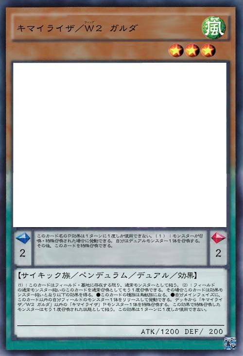 | (1):このカードはフィールド・墓地に存在する限り、通常モンスターとして扱う。(2):フィールドの通常モンスター扱いのこのカードを通常召喚としてもう1度召喚できる。その場合このカードは効果モンスター扱いとなり以下の効果を得る。●このカードの種族は鳥獣族になる。●自分メインフェイズに、このカード以外の自分フィールドのモンスター1体をリリースして発動できる。デッキから「キマイライザ/W2 ガルダ」以外の「キマイライザ」Pモンスター1体を特殊召喚する。この効果で特殊召喚したモンスターはもう1度召喚された状態として扱う。この効果は1ターンに1度しか使用できない。 | |||