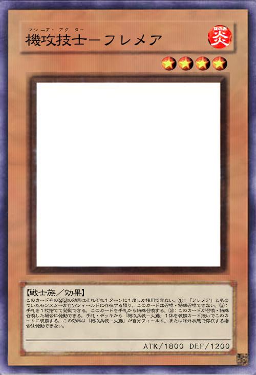 | このカード名の②③の効果はそれぞれ1ターンに1度しか使用できない。①:「フレメア」と名のついたモンスターが自分フィールドに存在する限り、このカードは召喚・特殊召喚できない。②:手札を1枚捨てて発動できる。このカードを手札から特殊召喚する。③:このカードが召喚・特殊召喚した場合に発動できる。手札・デッキから「機攻兵装-火鳶」1体を装備カード扱いでこのカードに装備する。この効果は「機攻兵装-火鳶」が自分フィールド、または除外状態で存在する場合は発動できない。 | |||