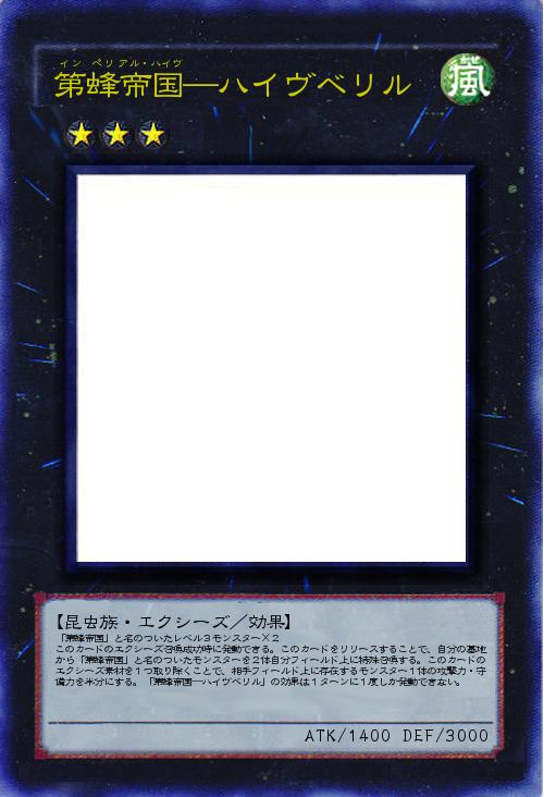 「第蜂帝国」と名のついたレベル3モンスター×2 このカードのエクシーズ召喚成功時に発動できる。このカードをリリースすることで、自分の墓地から「第蜂帝国」と名のついたモンスターを2体自分フィールド上に特殊召喚する。このカードのエクシーズ素材を1つ取り除くことで、相手フィールド上に存在するモンスター1体の攻撃力・守備力を半分にする。「第蜂帝国―ハイヴベリル」の効果は1ターンに1度しか発動できない。 |