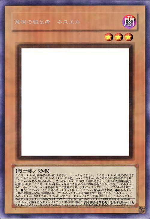 | このモンスターは特殊召喚素材にはできず、リリースもできない。このモンスターは通常召喚できず、このカード名のモンスターは1ターンに1度、カードの効果か①の方法でのみ特殊召喚できる。このカード名の②④の効果は、それぞれ1ターンに1度しか使用できない。①場の表側魔法罠を1枚墓地へ送り、このモンスターを手札・除外から特殊召喚できる。②自分・相手ターン中に、手札のこのカードを相手に見せて発動できる。発動タイミングにより、以下の効果を適用する。●自分のターン:自分の場のモンスター1体は、このターン貫通効果を得る。●相手のターン:場の表側魔法罠1枚を破壊する。③このモンスターの攻撃宣言時に発動できる。このターン、このモンスターは5回までモンスターに攻撃でき、ダメージステップ開始時ごとに、このモンスターの攻撃力を次のターンの終了時まで350アップする。④このモンスターが耐性効果を持つ相手モンスターと戦闘を行うダメージステップ開始時に発動できる。相手はそのモンスターを墓地へ送らなければならない。自分のLPが相手より少なければ、この効果の発動に相手はチェーンできない。 | |||
