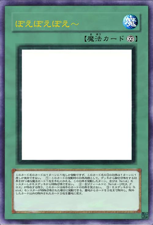| このカード名のカードは1ターンに1枚しか発動できず、このカード名の③の効果は1ターンに1度しか使用できない。 ①:このカードの発動時の効果処理として、デッキから融合召喚をする効果を持つ速攻魔法カード1枚を手札に加える。この効果を発動したターン、自分は「holoX」モンスターしかEXデッキから特殊召喚できない。 ②:自分フィールドに「holoX-沙花叉 クロヱ」が存在する限り、このカードは相手のカードの効果を受けない。 ③:EXデッキから「holoX」モンスターが特殊召喚された場合に発動できる。墓地からカードを2枚まで除外し、除外したカード以外の除外されたカード2枚を墓地に戻す。 | |||