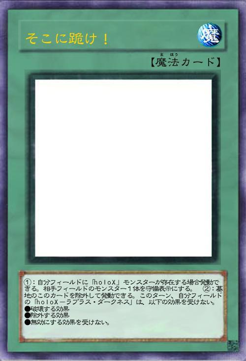 | ①:自分フィールドに「holoX」モンスターが存在する場合発動できる。相手フィールドのモンスター1体を守備表示にする。 ②:墓地のこのカードを除外して発動できる。このターン、自分フィールドの「holoX-ラプラス・ダークネス」は、以下の効果を受けない。 ●破壊する効果 ●除外する効果 ●無効にする効果 | |||
