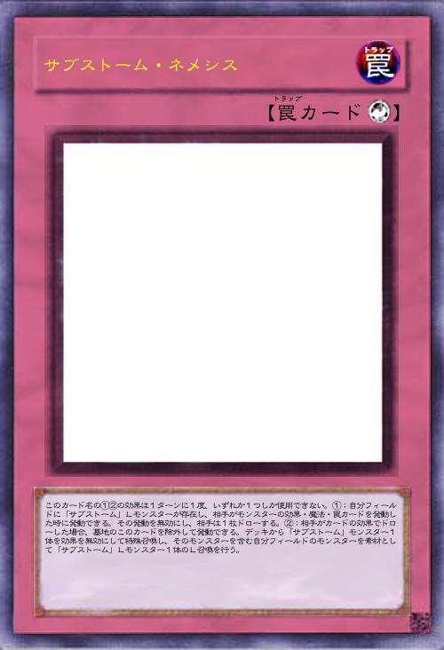 | このカード名の①②の効果は1ターンに1度、いずれか1つしか使用できない。①:自分フィールドに「サブストーム」Lモンスターが存在し、相手がモンスターの効果・魔法・罠カードを発動した時に発動できる。その発動を無効にし、相手は1枚ドローする。②:相手がカードの効果でドローした場合、墓地のこのカードを除外して発動できる。デッキから「サブストーム」モンスター1体を効果を無効にして特殊召喚し、そのモンスターを含む自分フィールドのモンスターを素材として「サブストーム」Lモンスター1体のL召喚を行う。 | |||