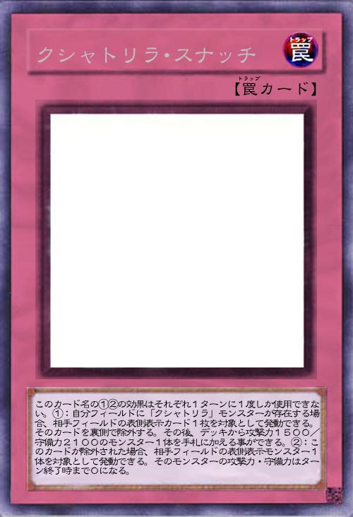 | このカード名の①②の効果はそれぞれ1ターンに1度しか使用できない。①:自分フィールドに「クシャトリラ」モンスターが存在する場合、相手フィールドの表側表示カード1枚を対象として発動できる。そのカードを裏側で除外する。その後、デッキから攻撃力1500/守備力2100のモンスター1体を手札に加える事ができる。②:このカードが除外された場合、相手フィールドの表側表示モンスター1体を対象として発動できる。そのモンスターの攻撃力・守備力はターン終了時まで0になる。 | |||