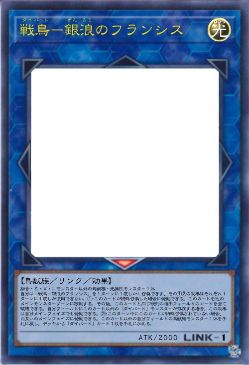 | 融合・S・X・Lモンスター以外の鳥獣族・光属性モンスター1体 自分は「戦鳥-銀浪のフランシス」を1ターンに1度しかL召喚できず、その①②の効果はそれぞれ1ターンに1度しか使用できない。①:このカードが特殊召喚した場合に発動できる。このカードを他のメインモンスターゾーンに移動する。その後、このカードと同じ縦列の相手フィールドのカードを全て破壊できる。自分フィールドにこのカード以外の「ダイバード」モンスターが存在する場合、この効果は自分メインフェイズでも発動できる。②:このターン中にこのカードが特殊召喚されていない場合、お互いのメインフェイズに発動できる。このカード以外の自分フィールドの鳥獣族モンスター1体を手札に戻し、デッキから「ダイバード」カード1枚を手札に加える。 | |||
