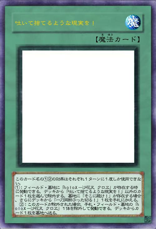 | このカード名の①②の効果はそれぞれ1ターンに1度しか使用できない。 ①:フィールド・墓地に「holoX-沙花叉 クロヱ」が存在する時に発動できる。デッキから「吐いて捨てるような現実を!」以外のカード1枚を選んで除外する。墓地に「そこに跪け!」が存在する場合、さらにデッキから「一刀両断ぶった切る!」1枚を手札に加える。 ②:このカードが除外された場合、手札・フィールド・墓地の「holoX-沙花叉 クロヱ」1体を除外して発動できる。デッキからカード1枚を墓地へ送る。 | |||