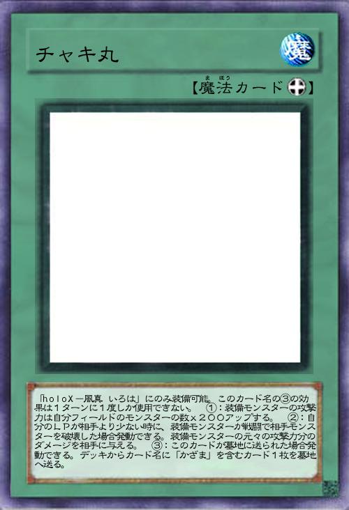 | 「holoX-風真 いろは」にのみ装備可能。このカード名の③の効果は1ターンに1度しか使用できない。 ①:装備モンスターの攻撃力は自分フィールドのモンスターの数x200アップする。 ②:自分のLPが相手より少ない時に、装備モンスターが戦闘で相手モンスターを破壊した場合発動できる。装備モンスターの元々の攻撃力分のダメージを相手に与える。 ③:このカードが墓地に送られた場合発動できる。デッキからカード名に「かざま」を含むカード1枚を墓地へ送る。 | |||